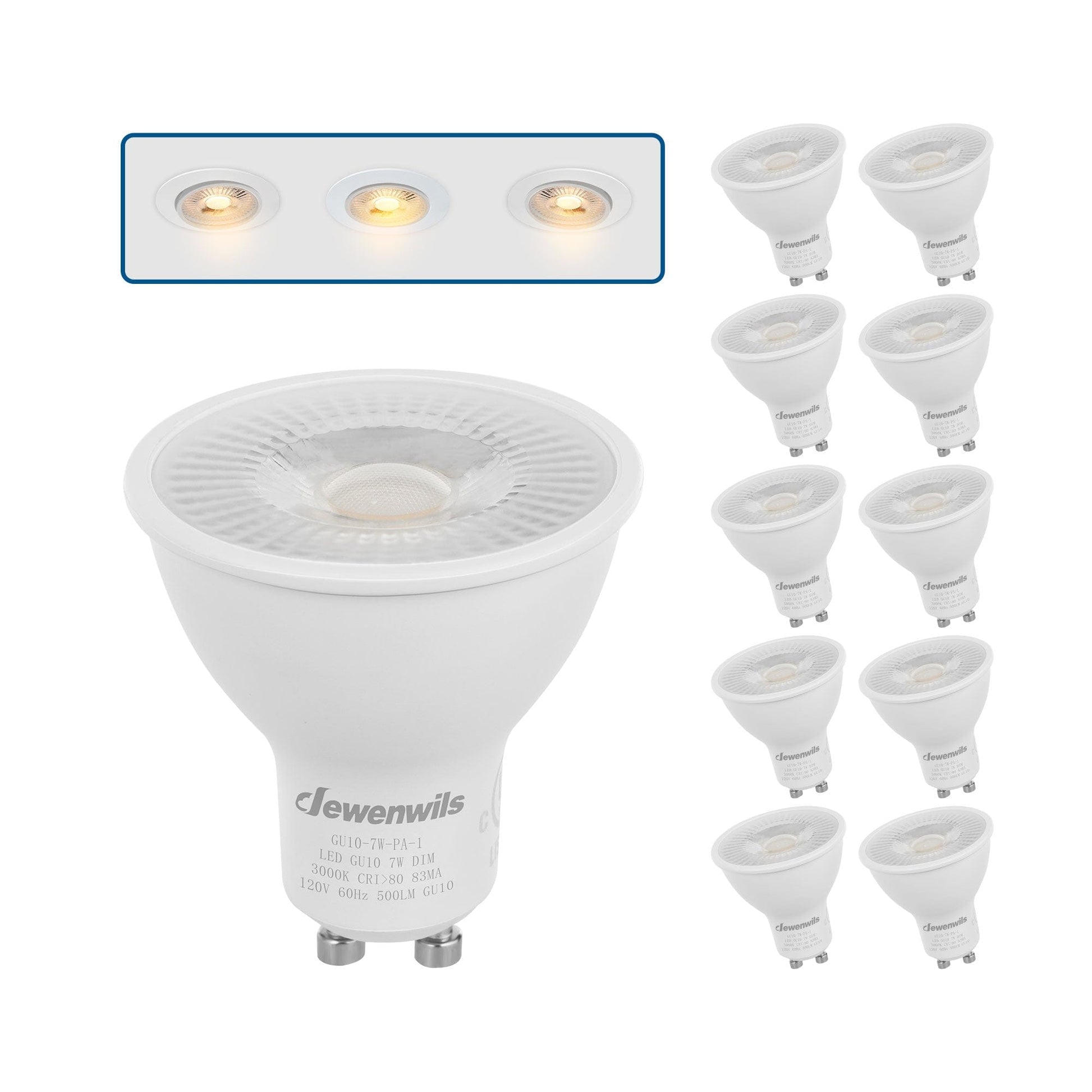 DEWENWILS GU10 base spotlights are aimed to replace your current 50-Watt halogen ones, these 7W LED bulbs are rated to last 10, 000 hours, much longer lifespan than the equivalent incandescent lights, saving your money and time.
