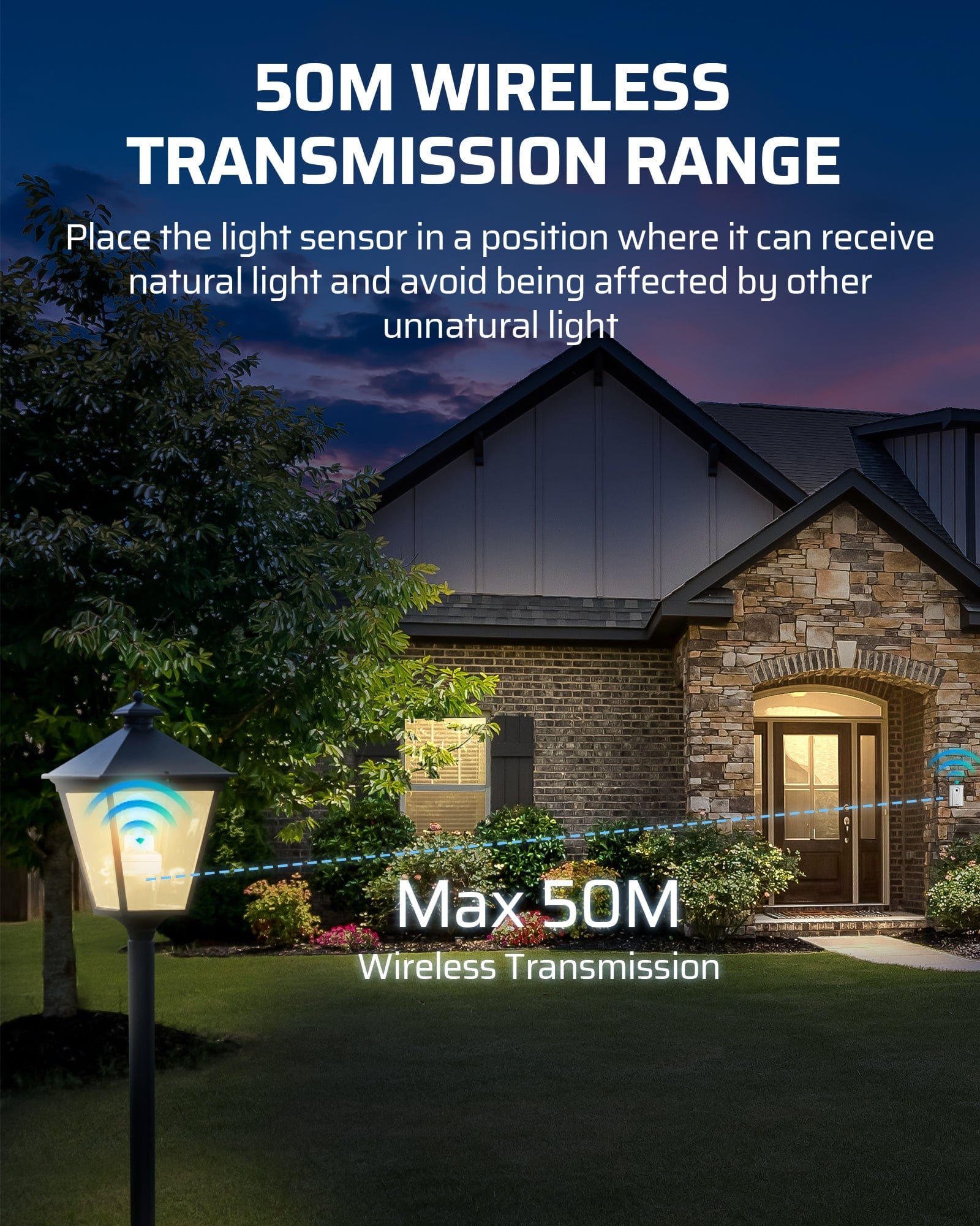 【Wireless Light Sensor】With built-in advanced dusk to dawn sensor, the transmitter automatically sends on/off signals to the lamp head; split design allows the distance between the light sensor transmitter and the lamp head to reach up to 50 meters