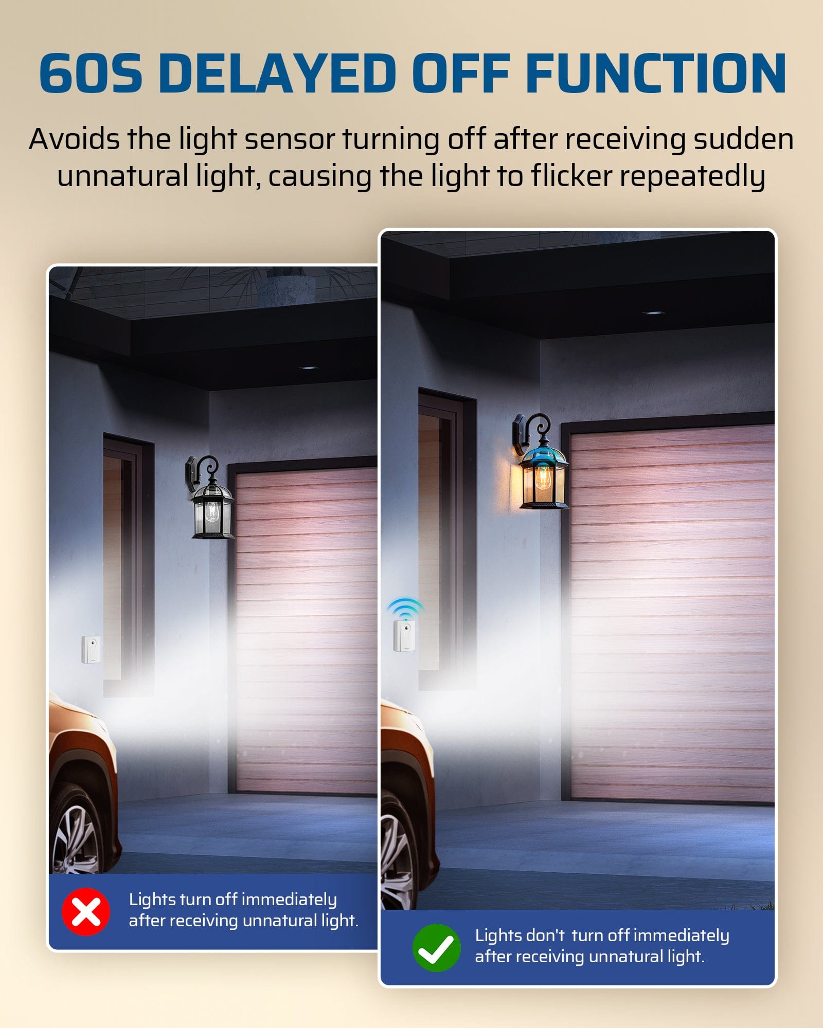【Off Delay Function】This dusk to dawn sensor socket is equipped with off delayed function to prevent flickering caused by the photocell detecting non-natural light sources; when the photocell detects light, the light stays on for 60 seconds or more before automatically turning off