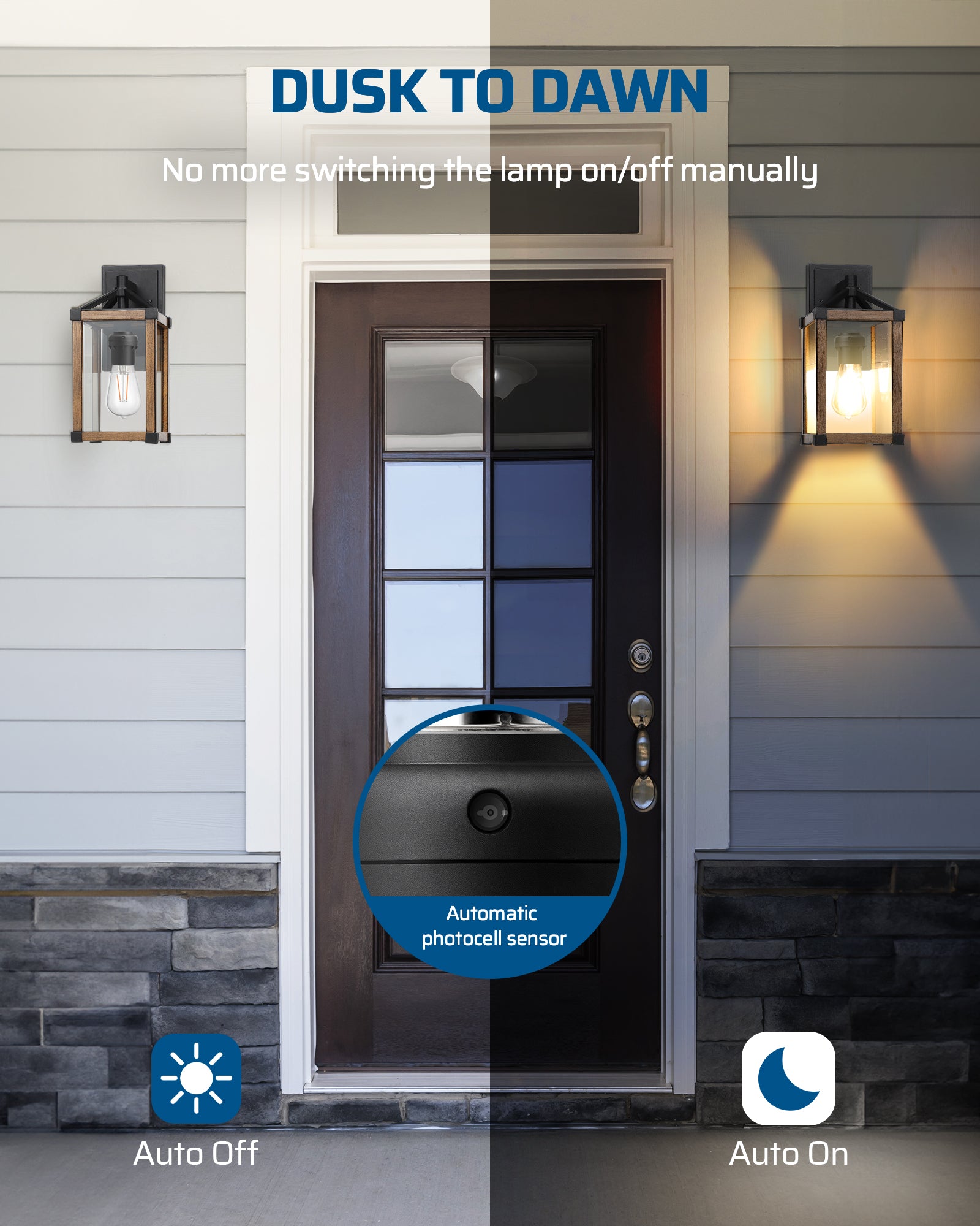 【Dusk to Dawn Sensor】With bulit in sensitive dusk to dawn sensor of light socket, the lights will automatically turn on at dusk and turn off at dawn; say goodbye to the hassle of manually controlling the lights, improve energy efficiency
