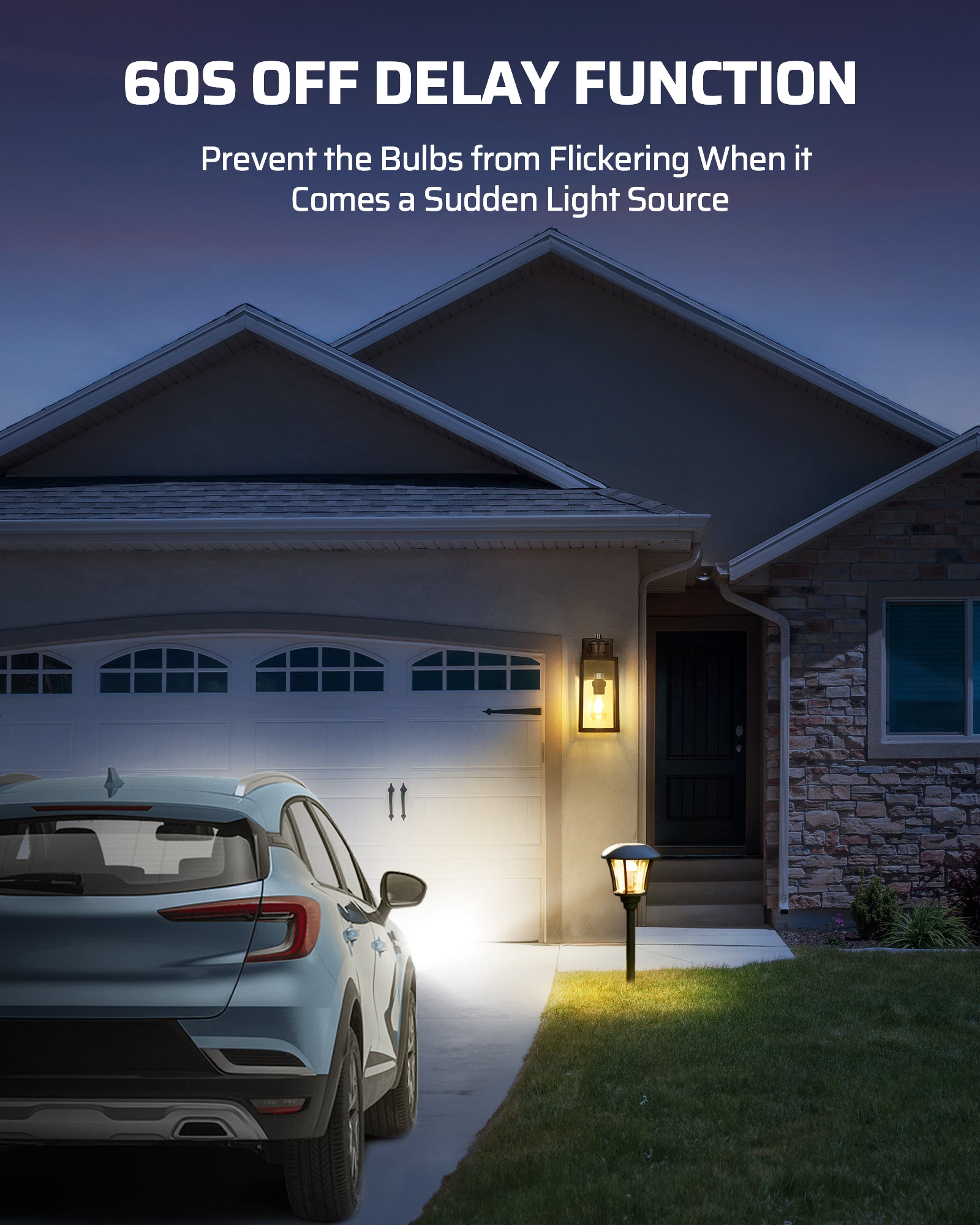 【60S OFF Delay】60S delay function prevents the bulb from flickering repeatedly due to sudden light source, and shuts off the bulb only after 60S of continuous irradiation in a dark environment; bring you a better lighting experience