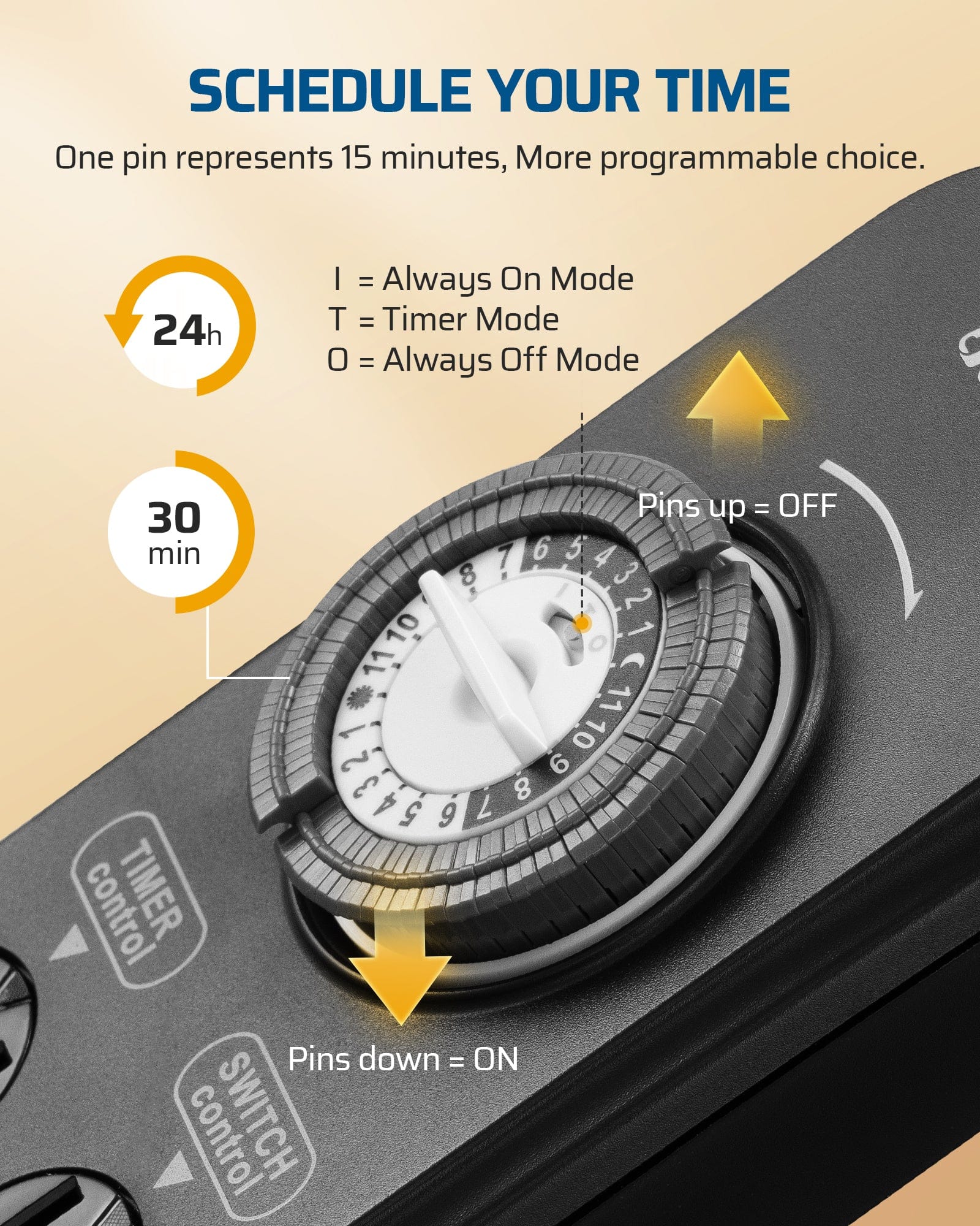 【Easy to Setup】This power strip timer schedule your devices at a minimum of 30-minute intervals in 24-hour cycle; pins up means off, pins down means on; daily on/off cycle timer function repeats every day at your chosen time