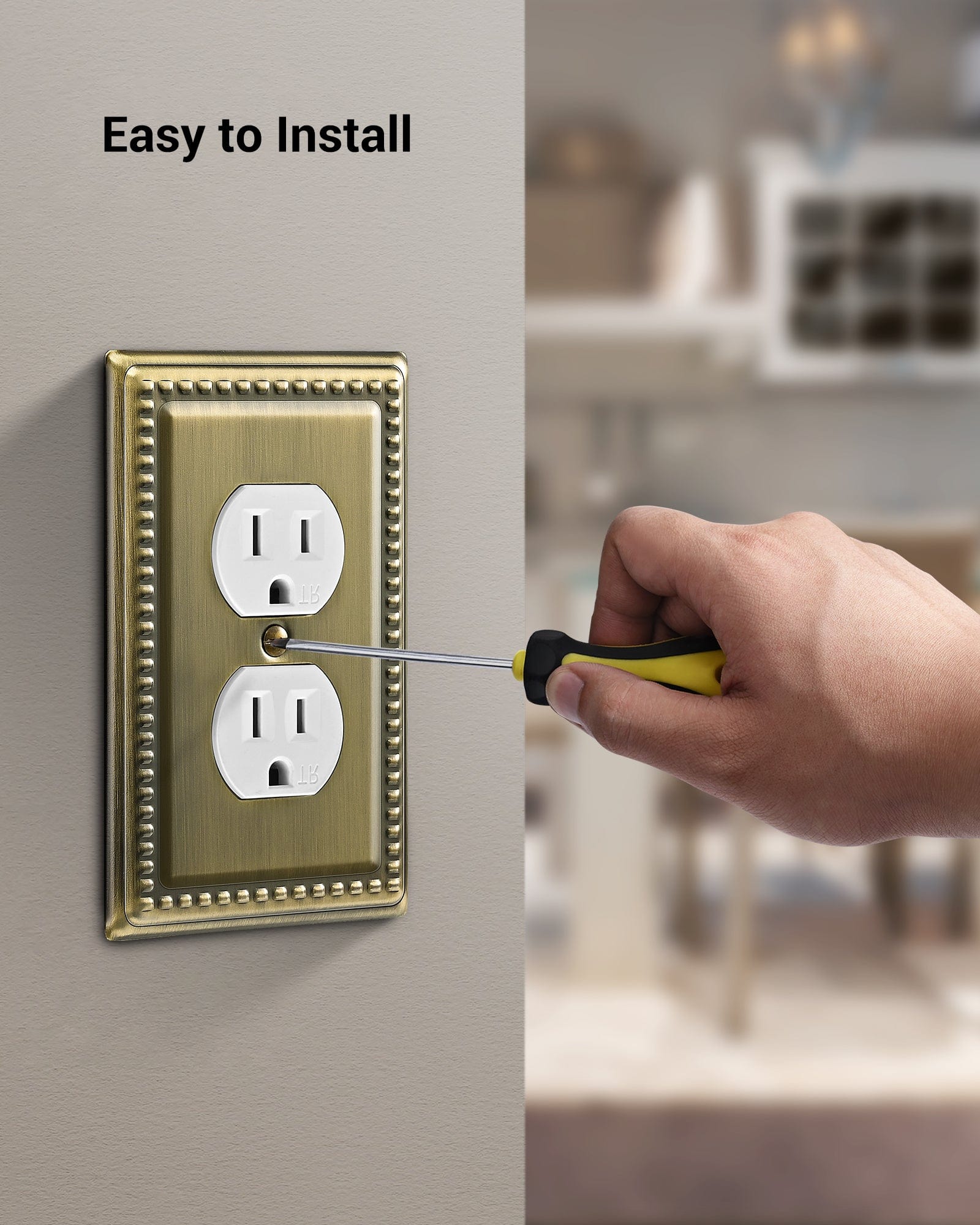【Modern Design】The antique brass color of our decorative wall plate hangers beautifully complements the pearl border, creating a simple and elegant look for your home. These hangers are suitable for various designs and are perfect for use with dimmer switches, toggle switches, outlet receptacles, and GFCI outlets. They add a touch of sophistication to any space.