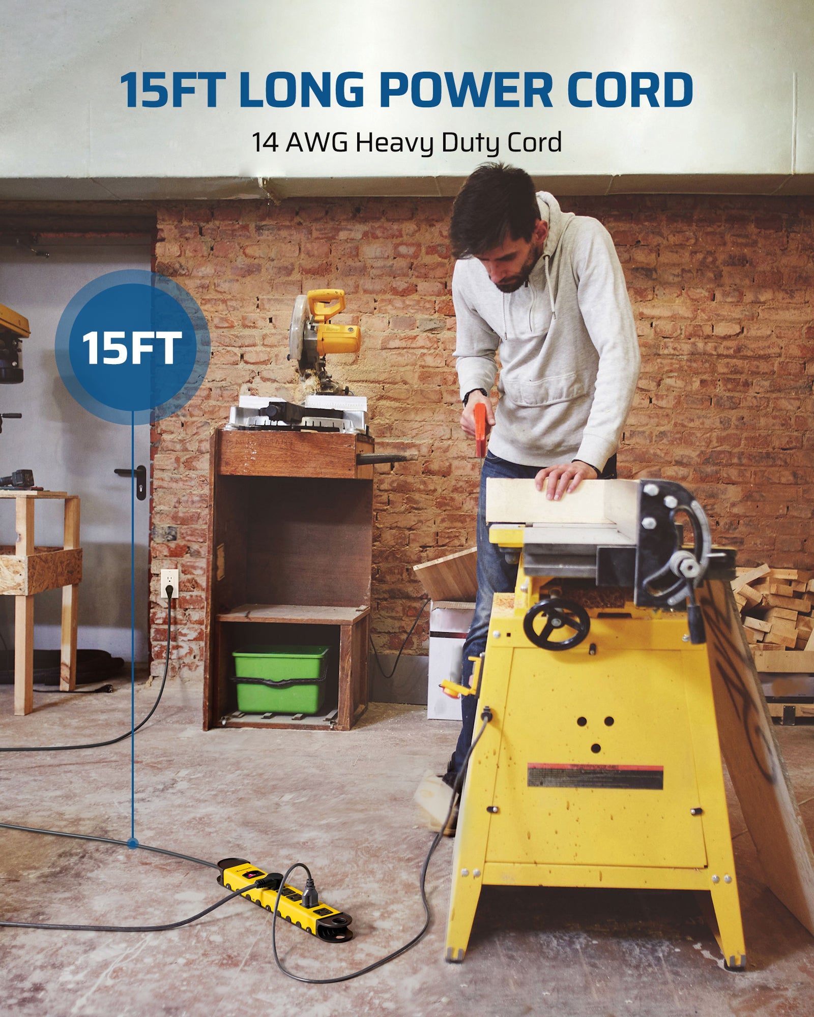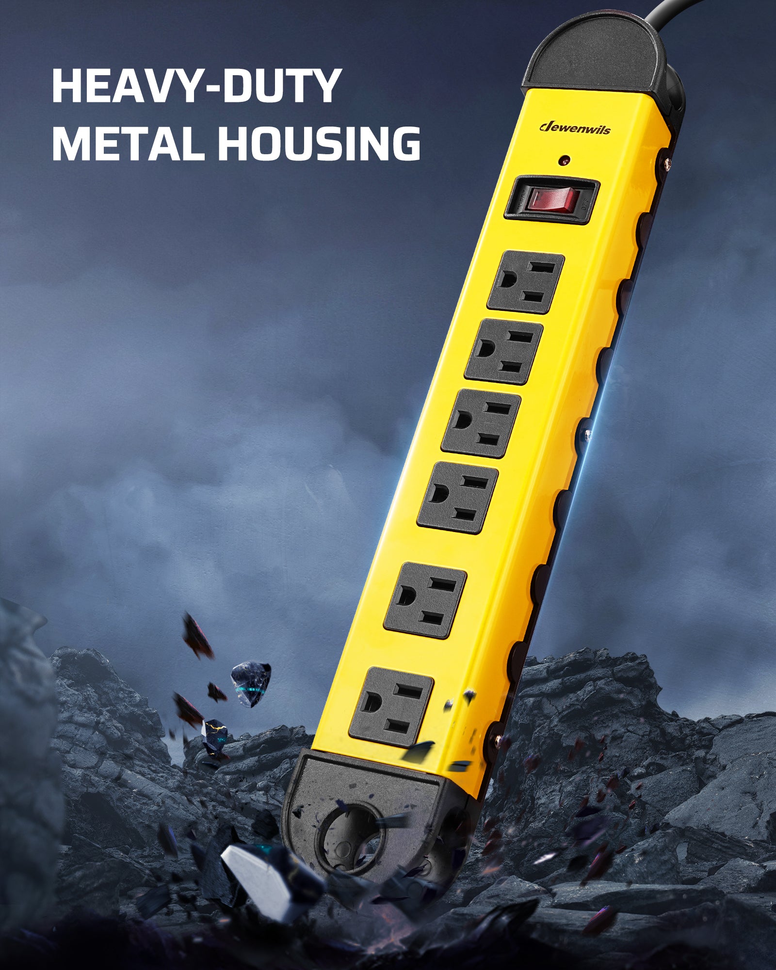 【Durable Power Strip】This power strip has a sturdy appearance with a metal casing, making it great for use in harsh environments like workshops, job sites, garages, and offices. Its not-easily-breakable material ensures durability for long-term use. Additionally, its yellow color makes the power strip easily identifiable in toolboxes or workstations.