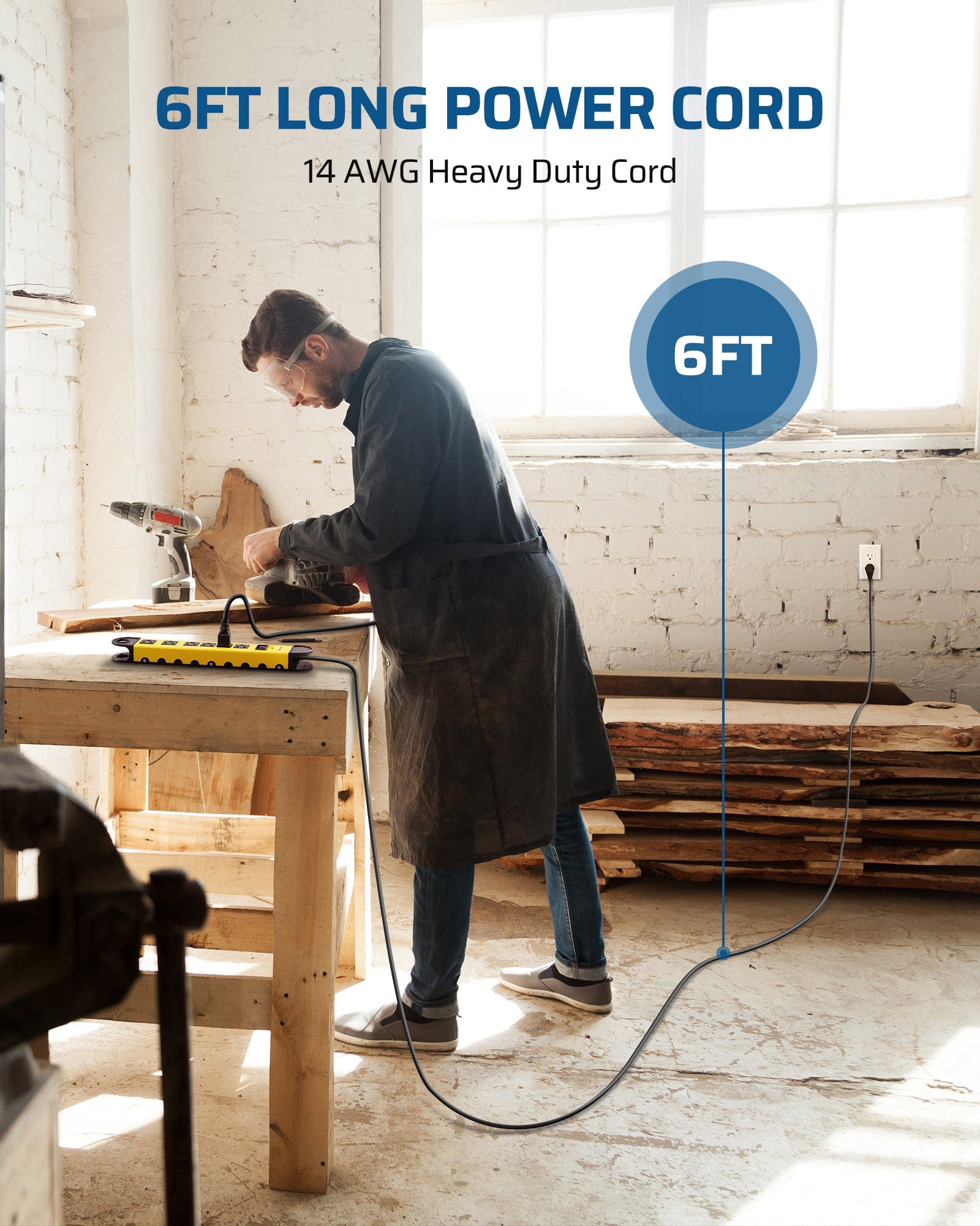 【Durable Power Strip】Crafted with a robust metal casing, perfect for challenging harsh and poor environments such as workshops, job sites, garages, and offices, resistant to material breakage, its distinctive yellow color makes the 6-outlet power strip easily identified in the tool