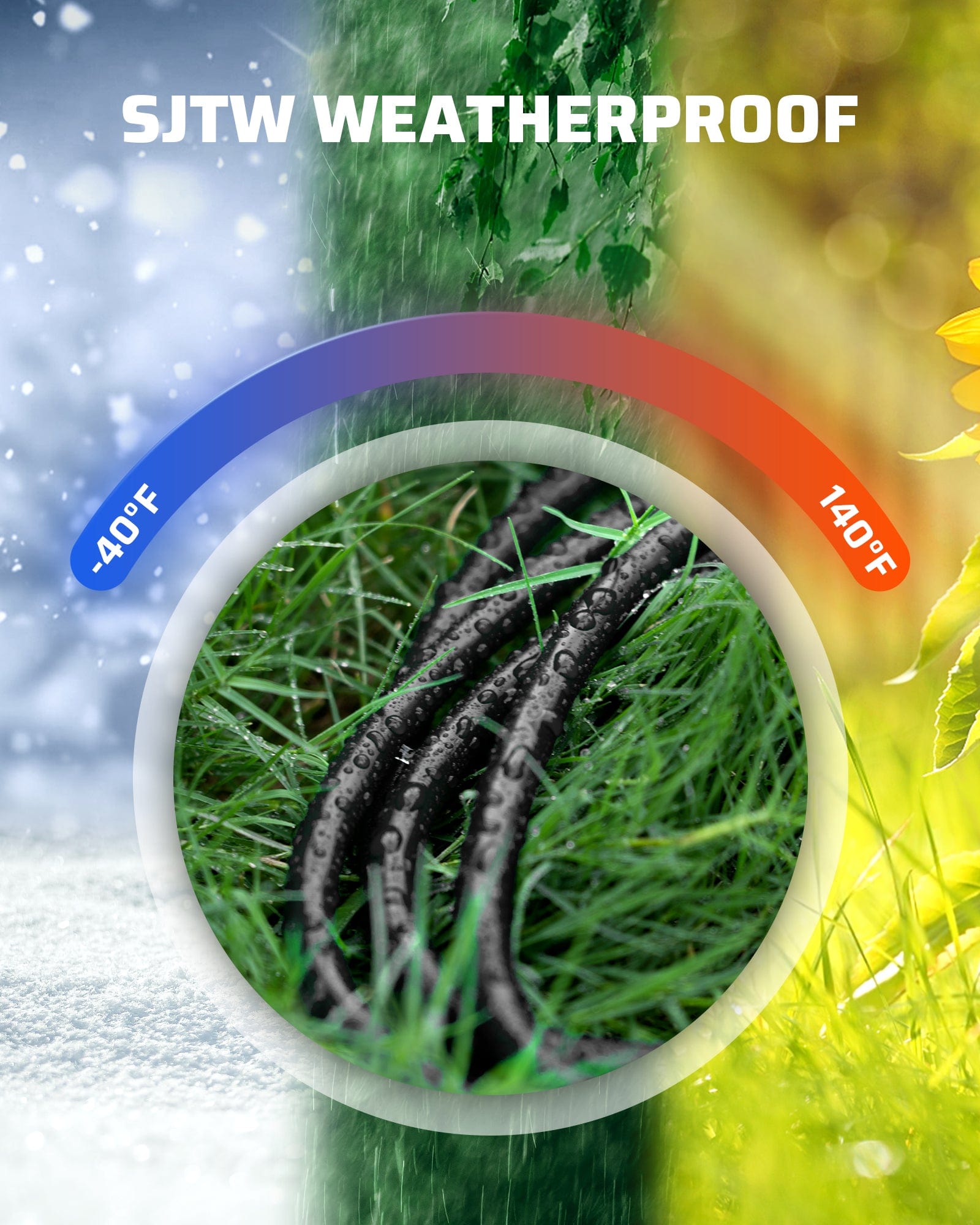 【14/3C SJTW Weatherproof Wire】This power cord extension is made of 14/3 gauge upgraded SJTW wire which is rated as weatherproof. It can withstand temperatures from -40°F to 140°F, with a PVC jacket that protects against moisture, abrasion, and direct sunlight. However, it's important to note that the connections should not be immersed in water.
