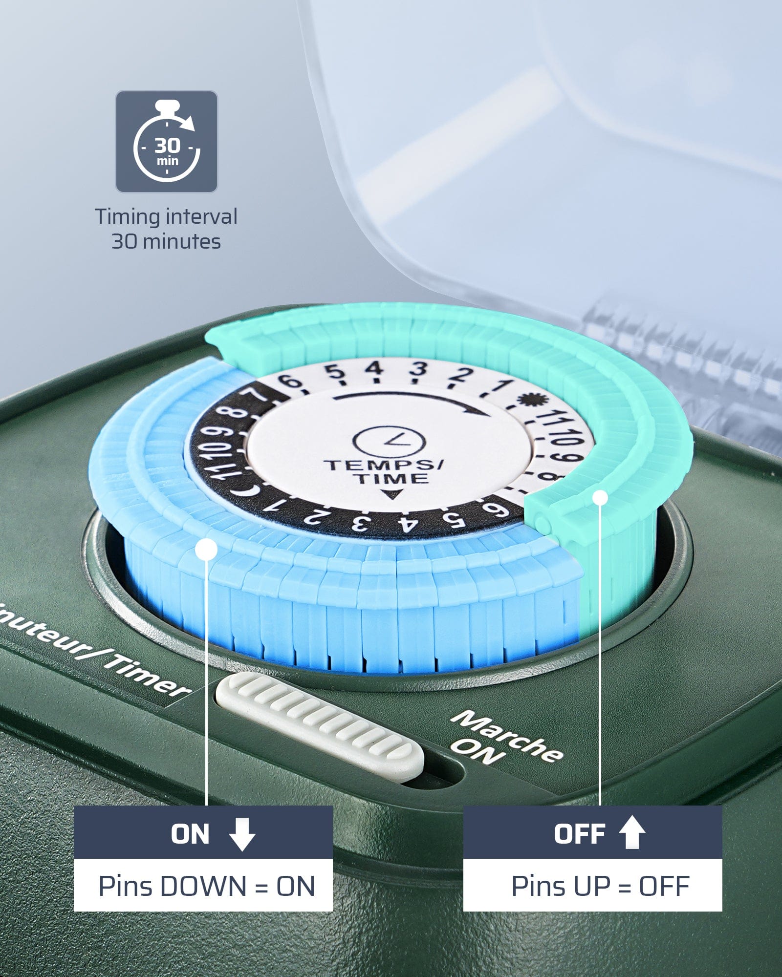 【48 ON/OFF SETTINGS PER DAY】This timer is programmable in 30-minute intervals, with 48 setting options available within a 24-hour period. It can be tailored to your personal needs and can repeat your schedule daily.