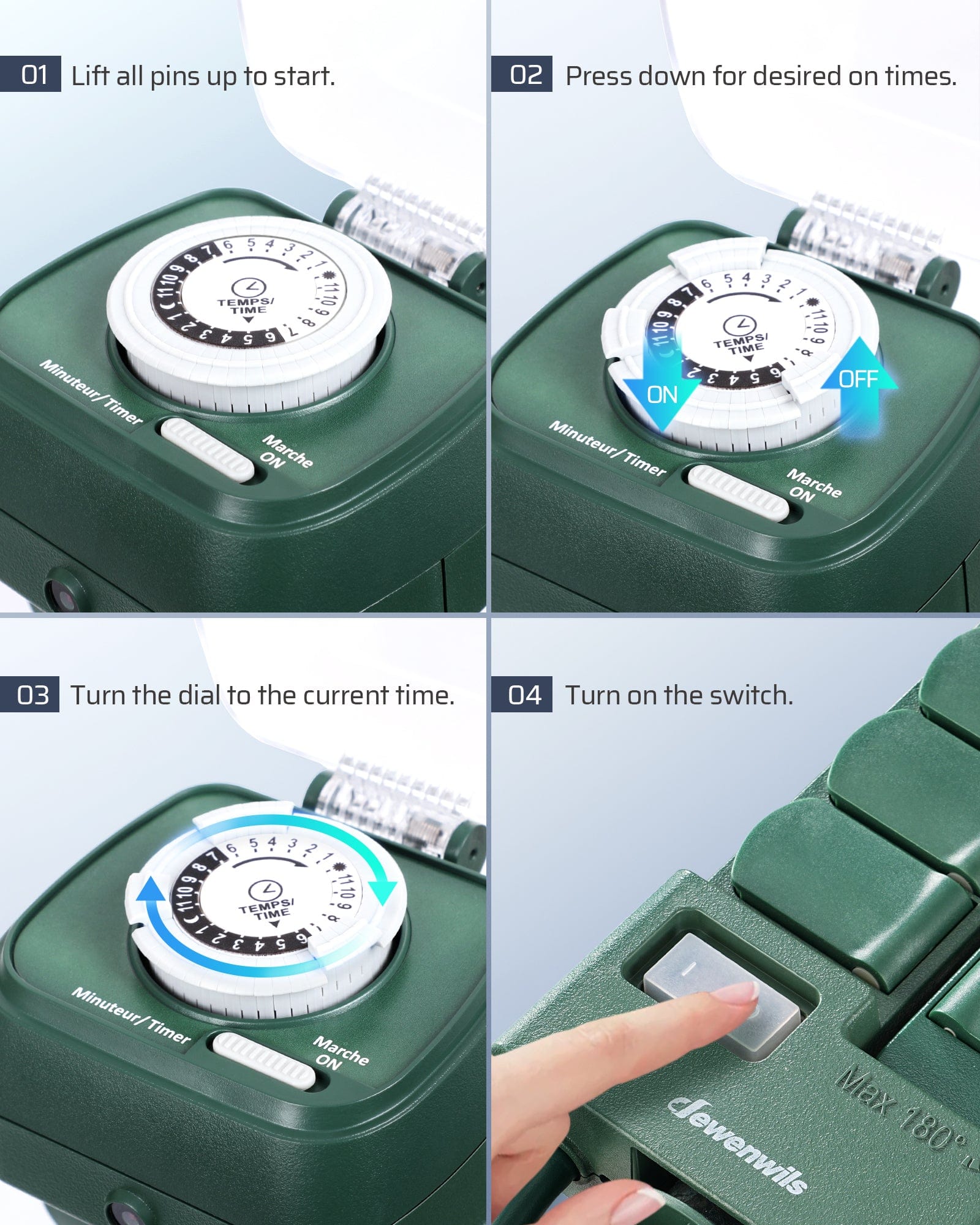 【WEATHERPROOF for OUTDOOR USE】The timer features individual weatherproof covers that protect all six outlets from water, dust, and damage. It can be used during rainy or snowy days, and its dark green color blends into the landscape, making it perfect for outdoor devices such as electrical outlets, pool pumps, fountains, Halloween decorations, and more.