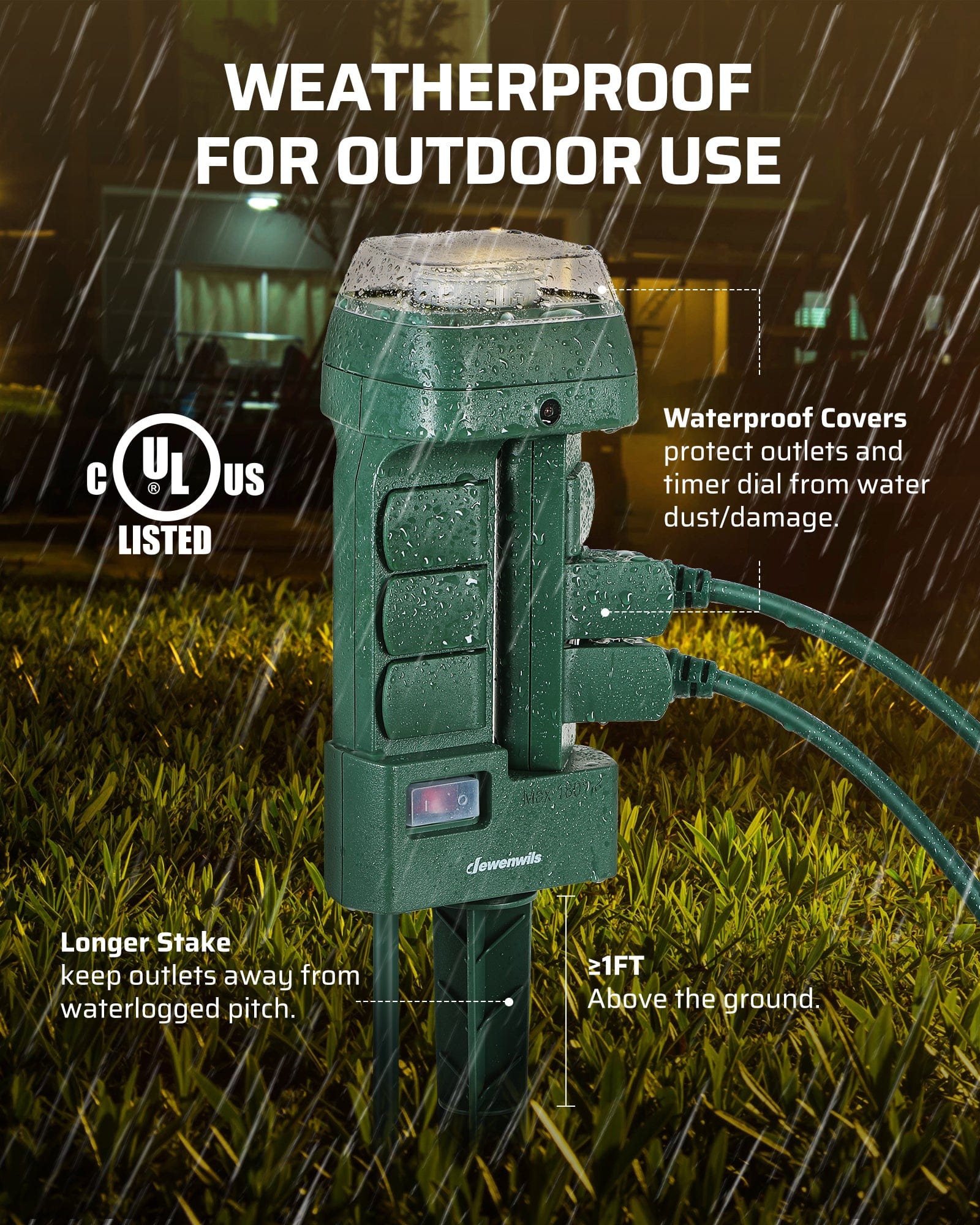 Outdoor power stake timer can be plugged up to 6 devices at a time, making it a nifty space-saving solution for your multiple outdoor lighting needs.