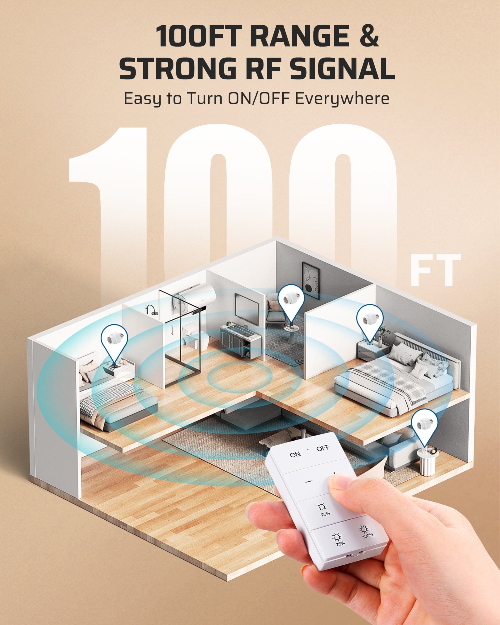 【100FT Control Range】Strong RF signal easily works through walls and doors without interference, offering a seamless control range of up to 100ft in open spaces; you can conveniently control distant garage or porch lights, makes you life easier