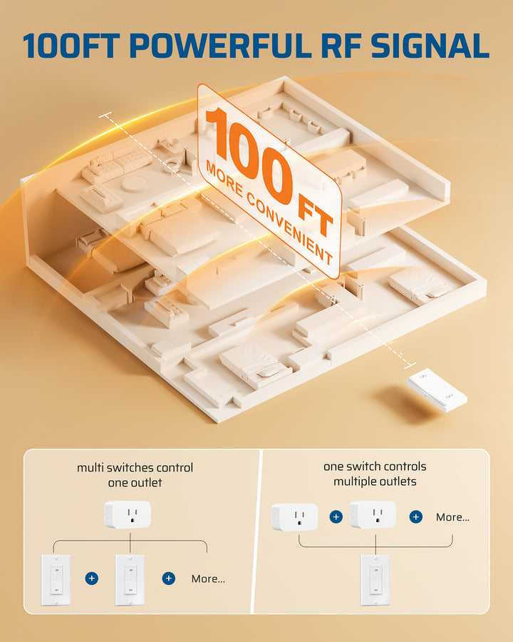 - [Stable RF Signal] Wireless switch features advanced RF technology, no interference, ensuring reliable control even when other remote devices are nearby; up to 100 feet control range, the wireless outlet signal penetrates walls, so you can operate appliances from anywhere in your home without disruption