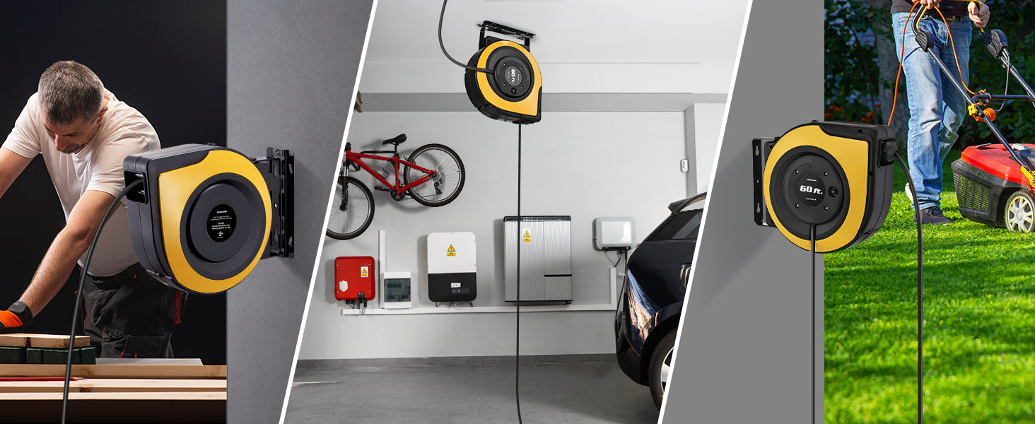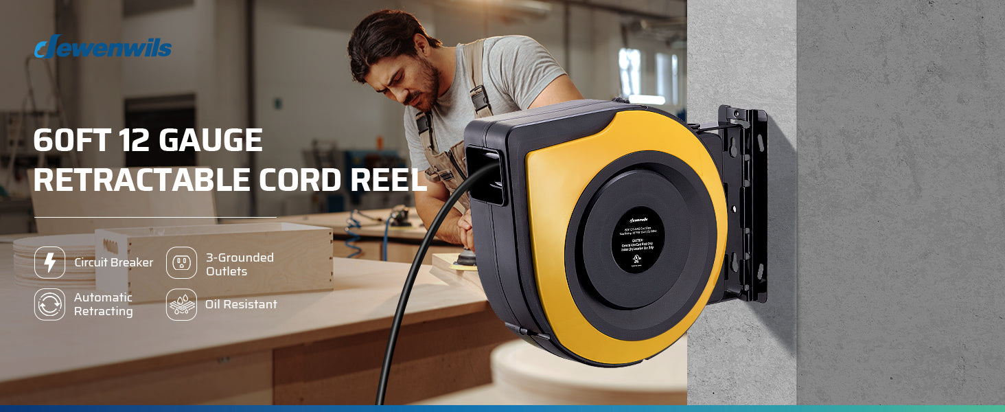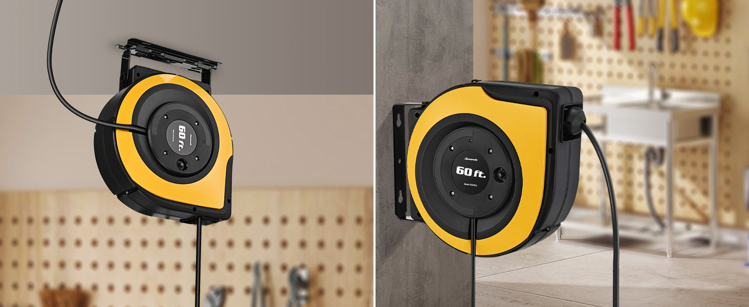 【60FT Long Power Cord Reel】The 60ft extension cord reel features a weather-resistant and flexible SJTOW cord with 12/3C gauge. It can withstand harsh conditions like UV rays, rain, oil and acid in a typical garage, while also functioning optimally in low temperatures. The 4.5ft lead-in cord offers ample distance from the socket within the installation area. Suitable for indoor or dry-location use, this extension cord meets the demands of large-space usage.