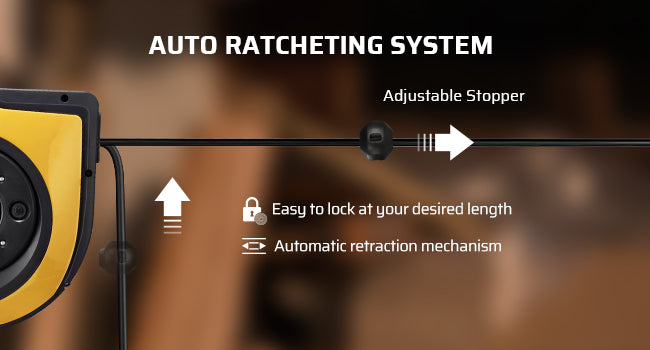 【 Automatic Ratcheting System 】The extension cord reel features a smart auto-guide rewind mechanism to prevent kinks and tangles, allowing for quick and smooth retraction. Its flexible stopper adjusts the length of the cord and prevents it from getting stuck in the slot while the ratcheting system allows for locking at any length, keeping the reel neat and easy to store.