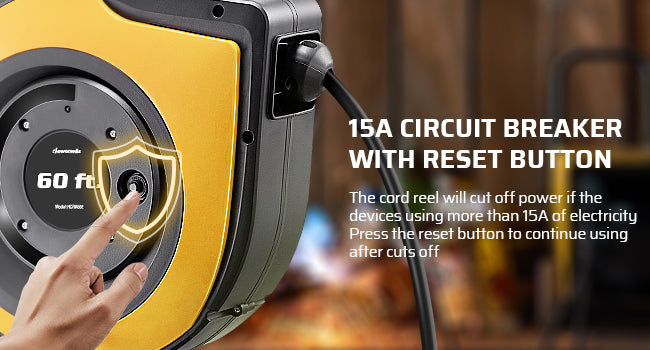 【Build-in 15A Circuit Breaker】The DEWENWILS extension cord reel is equipped with a built-in 15A circuit breaker, providing protection against short circuits and overloads. If the total current of connected devices exceeds 15A, the power supply will automatically cut off. Simply press the reset button to continue use and ensure ultra-safe operation. Certified to UL standards, trust in the safety and reliability of the DEWENWILS extension cord reel for years to come.