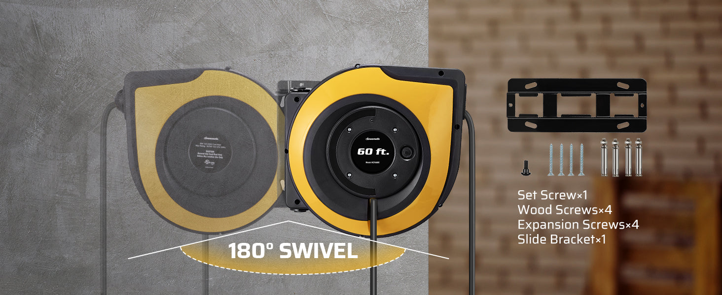 【Slide Bracket with 180°Swivel】The retractable extension cord reel is easy to install on walls, ceilings, or rafters with included screws and a swivel mounting bracket. Ideal for DIY, industrial, and workplace applications, it saves space and organizes cords. The 180° swivel mounting bracket allows for easy pulling and releasing of the cord from different directions.