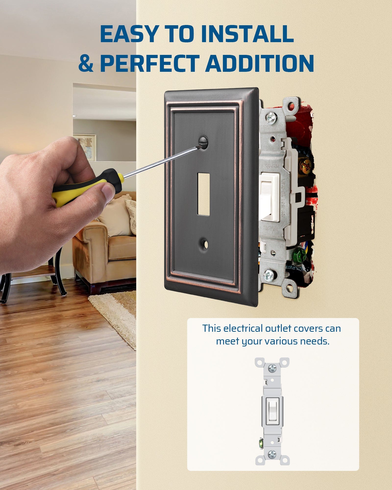 【Classic Aged Bronze Finish】Aged Bronze finish seamlessly blends into any decor style, great for living rooms, bedrooms, bathrooms, and kitchens; our light switch covers enhance your home's look and add a modern, upscale vibe