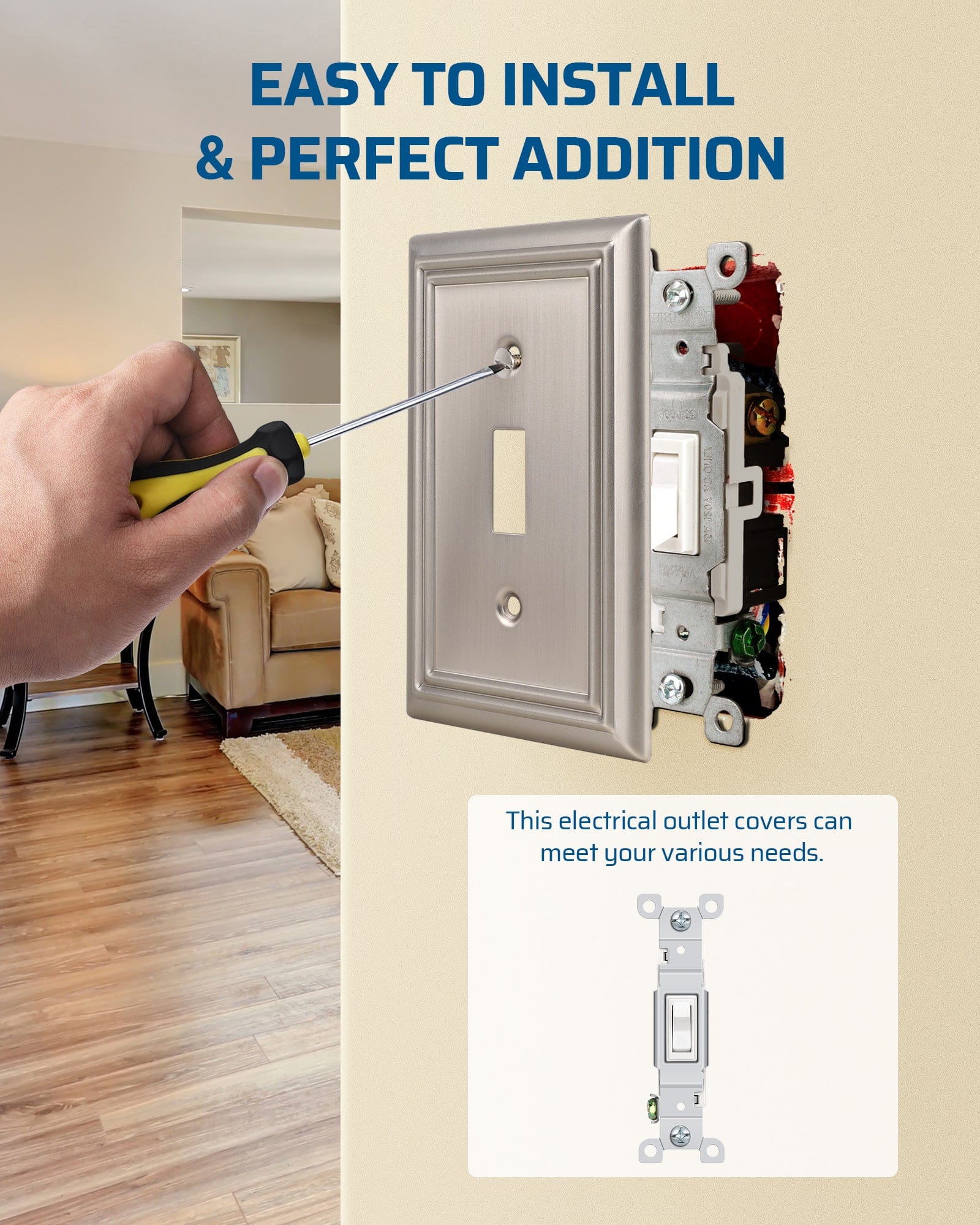 【Classic Brushed Nickel Finish】Brushed nickel finish seamlessly blends into any decor style, great for living rooms, bedrooms, bathrooms, and kitchens; our light switch covers enhance your home's look and add a modern, upscale vibe