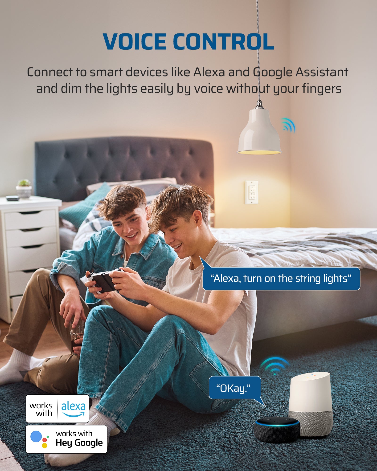 【Quick & Easy Connection】Features 2.4GHz Wi-Fi & Blue-tooth for intelligent connection; lighting control with Alexa and Google Assistant, compatible with Android and iOS; our indoor lighting dimmer can also allow for easy voice-controlled dimming