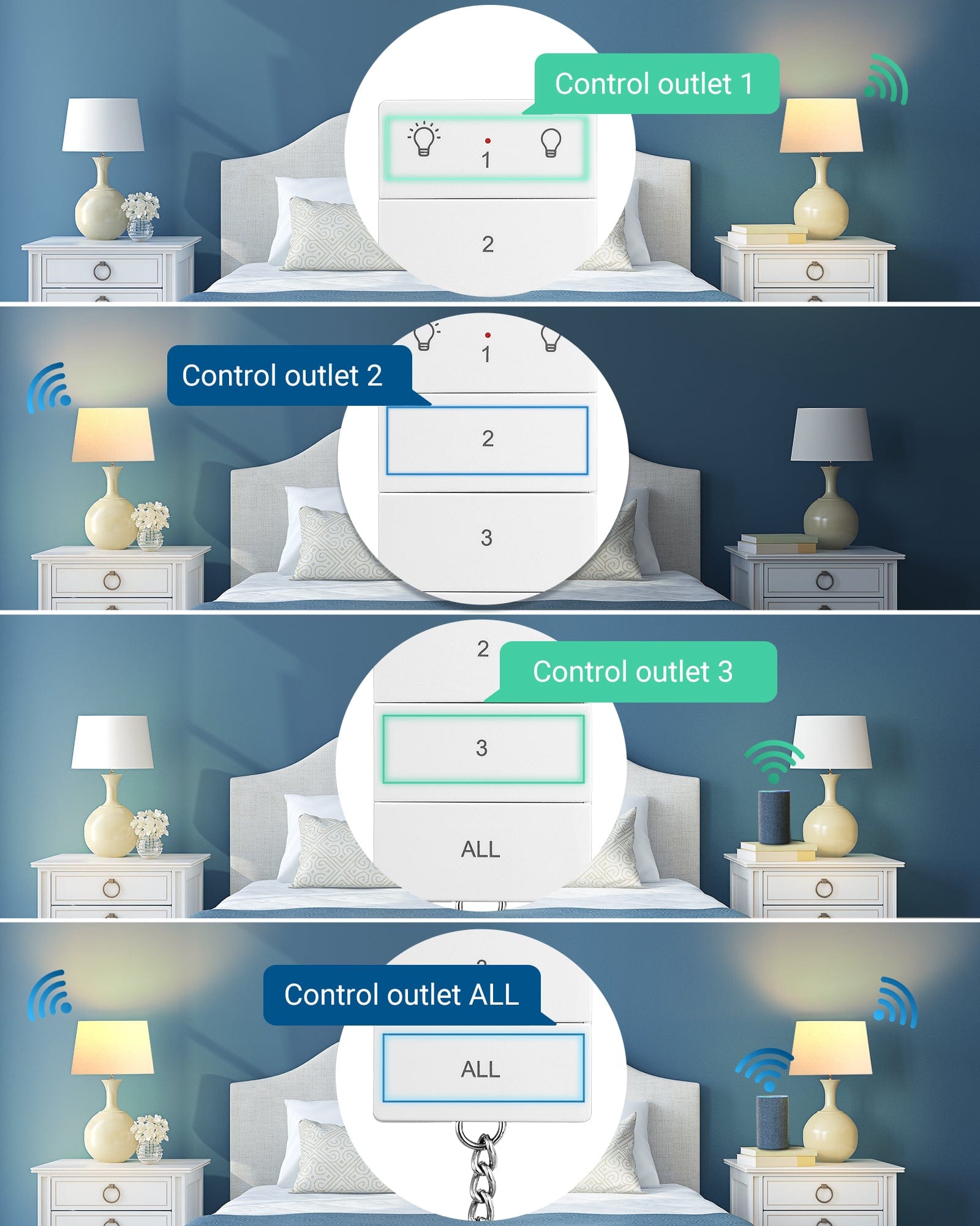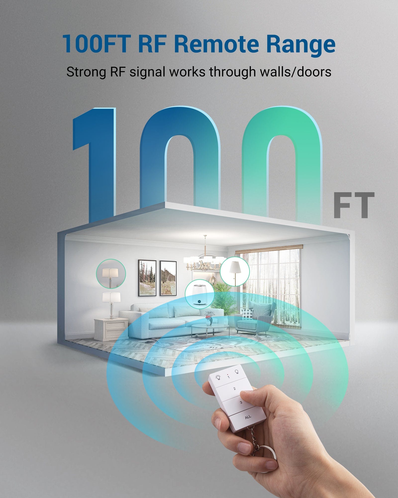 【Independent Control & Strong Signal】The electrical plug-in on-off power switch includes 1 transmitter and 3 receivers. The transmitter's "ALL" button acts as a general control switch. The 3 outlets can be controlled separately by the same remote switch and function independently. The strong RF signal can pass through walls and doors within a range of 100 feet in open areas, without any interference.