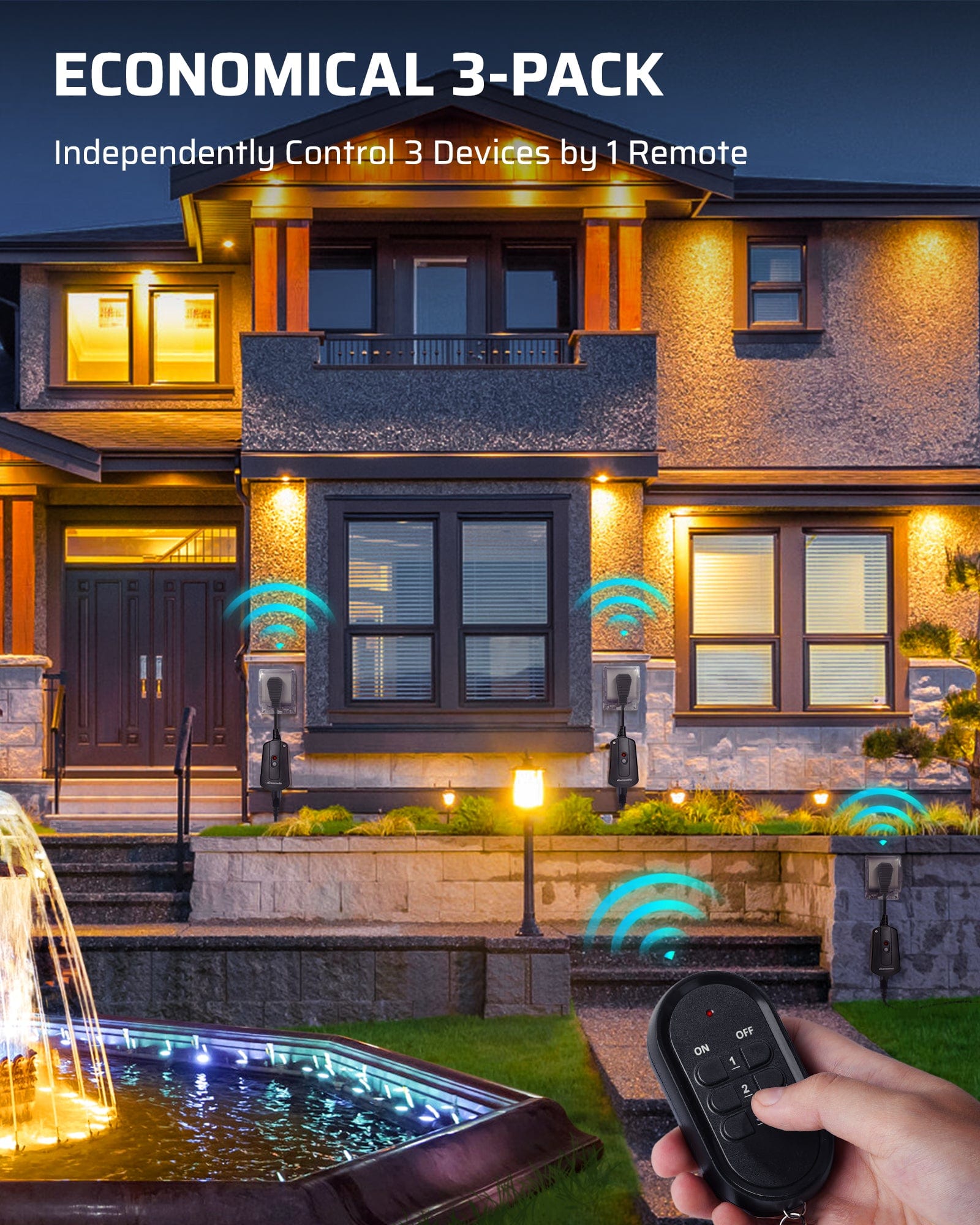 【 Remote Control 】 Remotely turn on/off indoor and outdoor lighting fixtures, patio string lights, decorative lighting, floor lamps, fans, pool fountain pumps, and other appliances with the push of a button. Wireless remote outlet switches can also be operated manually.