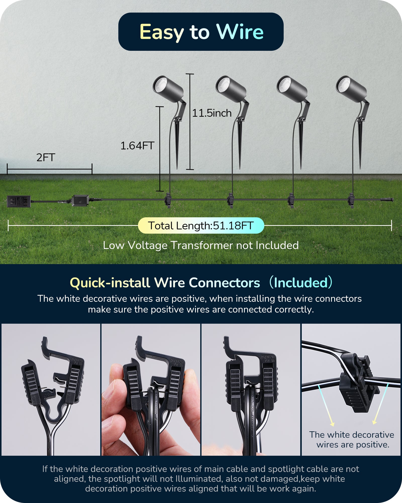 【Easy to Install】Includes ground stakes and quick-install wire connectors for each outdoor landscape light, safe to use and stay firmly in place; lamp head angle can be easily adjusted up and down, allowing you to customize the lighting direction to create the perfect outdoor ambiance. The distance between lights can be freely set according to the scene, making the installation more flexible